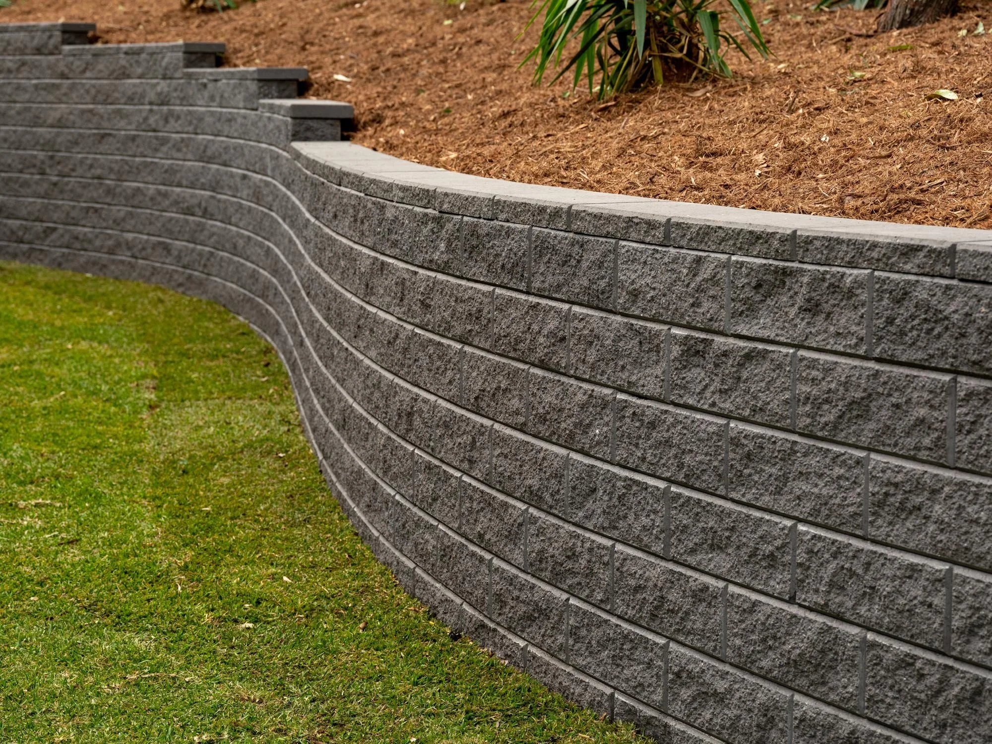Set against a backdrop of tall gums and dappled shade, this curved retaining wall brings a crisp, contemporary line to a natural bush setting. Built using Modernstone blocks by National Masonry, the design strikes a balance between bold geometry and subtle integration—holding back the earth while still feeling part of the landscape. The dark charcoal tone anchors the space visually, creating contrast against the surrounding greenery and mulch.